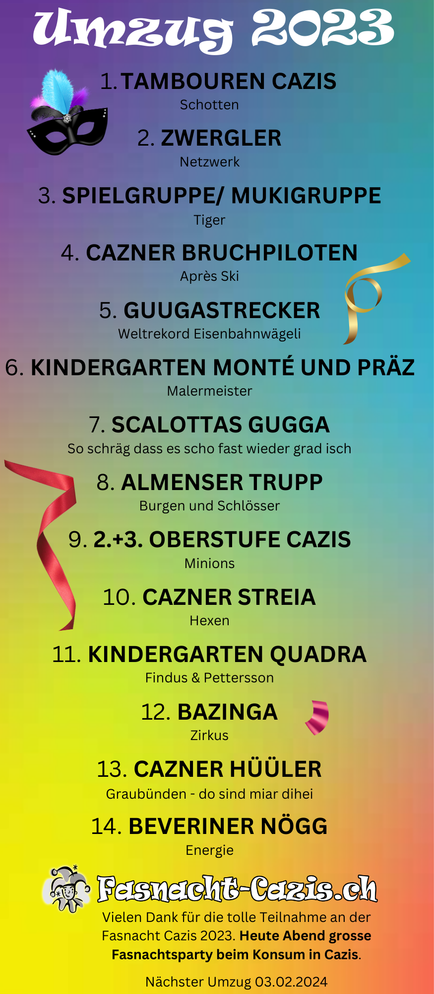 Wie dem Program schon zu entnehmen ist, wird es leider um 02:00 Uhr fertig sein mit dem Narrentreiben in Cazis. Aber schon nächstes Jahr geht es wieder los. Wir hoffen das neue Konzept noch mehr ausbauen zu können und freuen uns über noch mehr anmeldungen.